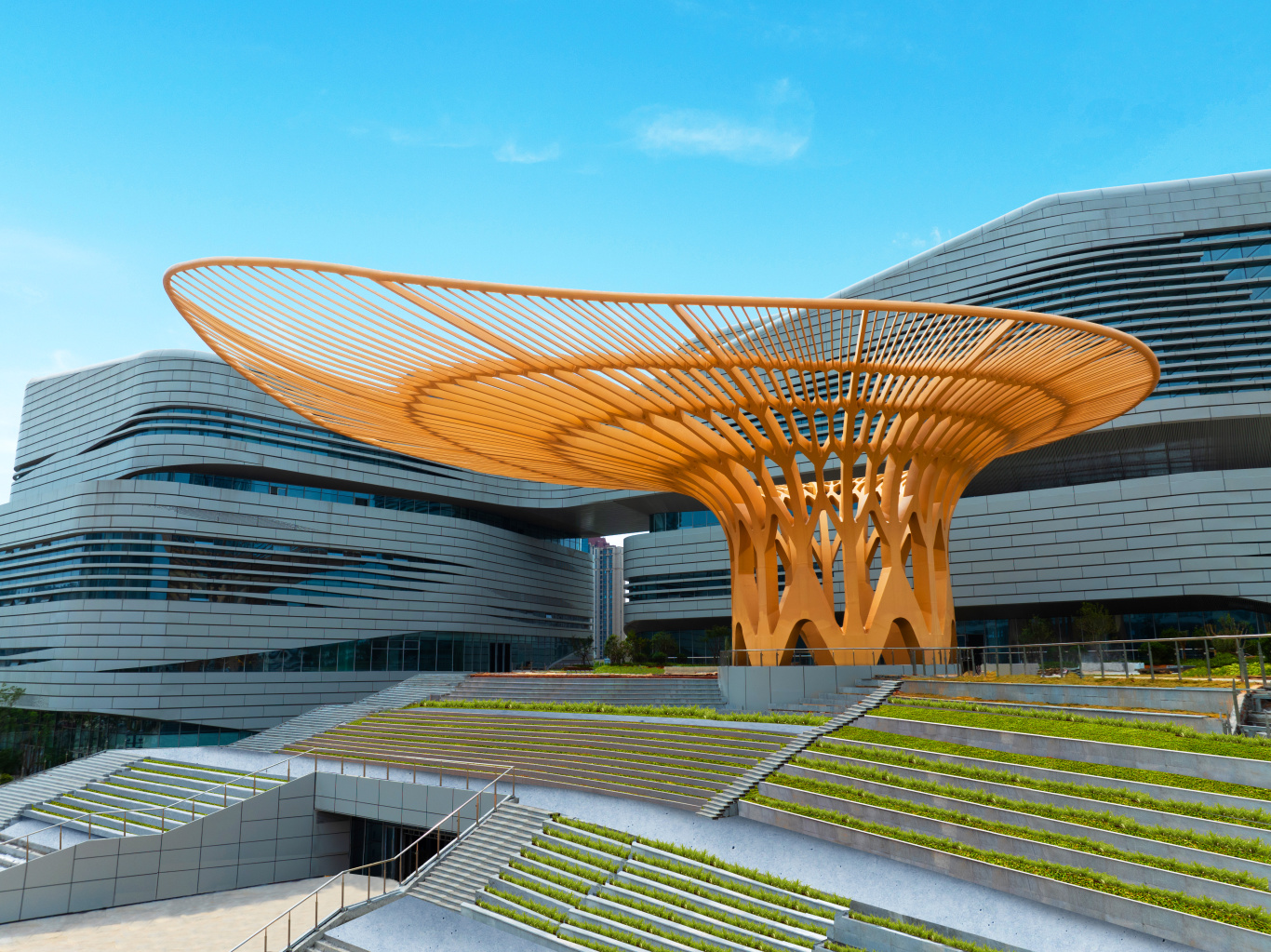 · 赣州“三馆一书城”:打造世界最大单体不锈钢树状结构,融合自然意象与结构力学,成为城市文化新象征。中部8根巨柱向上生长,构建出榕树般盘根错节的立体脉络。460吨钢结构以精密计算为支撑,最大悬挑跨度38米,直径达56米,如巨伞舒展,契合榕树“独木成林”的生命意象。