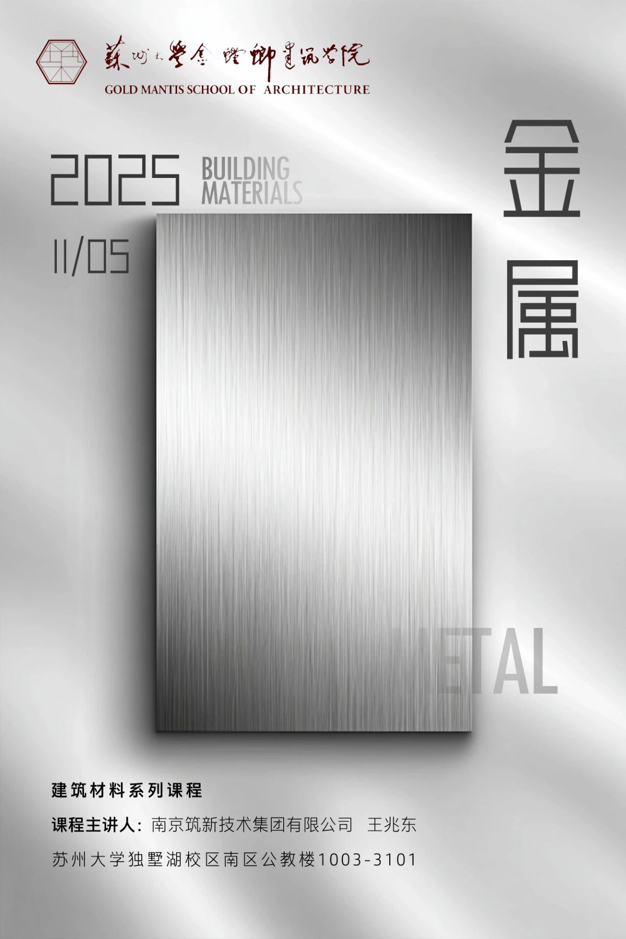 11月5日,南京筑新技术集团董事长王兆东受邀走进苏州大学金螳螂学院,以《用科技诠释艺术,探讨金属材料的可能性》为主题,为建筑系学子带来一堂专业而精彩的课程。