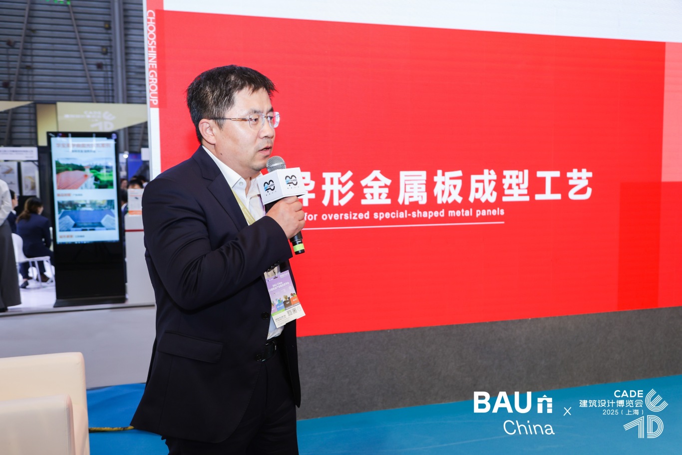11月5日,2025 CADE建筑设计博览会于上海启幕。在备受瞩目的Facade LAB20 “地表最强样板”主题展区,南京筑新技术集团有限公司带来了关于“超大异形金属板成型工艺”的深度答卷。董事长王兆东先生受邀出席,与业界共享南京筑新的创新实践,引领了一场关于建筑外立面如何融合创意、技术与可持续性的深度对话。
