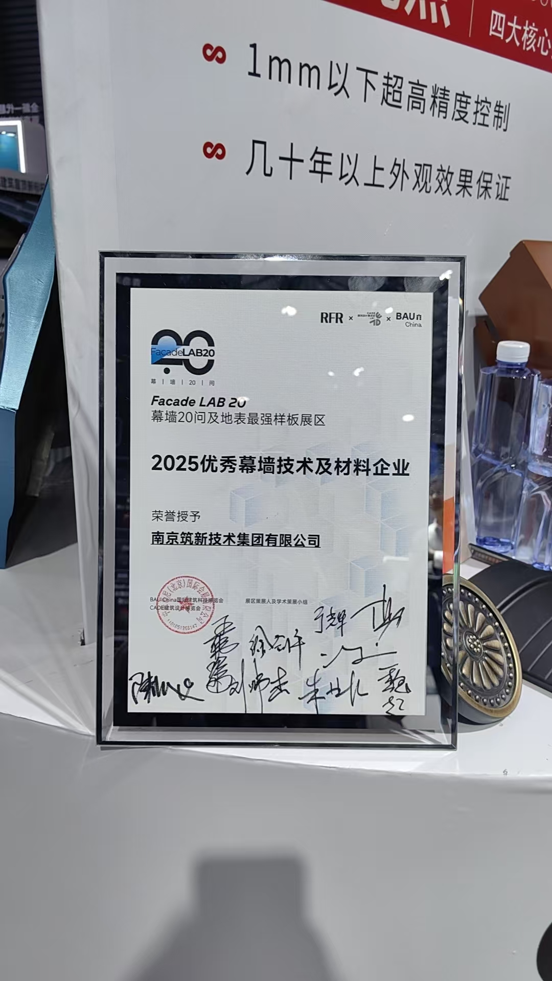 在FacadeLAB20 “幕墙20问”主题特展上,南京筑新技术集团有限公司凭借行业领先的“超大异形金属板成型工艺”,荣获“2025优秀幕墙技术及材料企业”称号。该荣誉不仅是对我们在幕墙设计美学与成型工艺创新上的高度认可,更彰显了筑新科技在异形金属板数字化设计、柔性成形与全过程精准管控方面的系统实力。未来,我们将持续深耕超大异形幕墙技术前沿,以更多创新、可靠的解决方案,为建筑外立面的艺术表达与技术实现赋能。